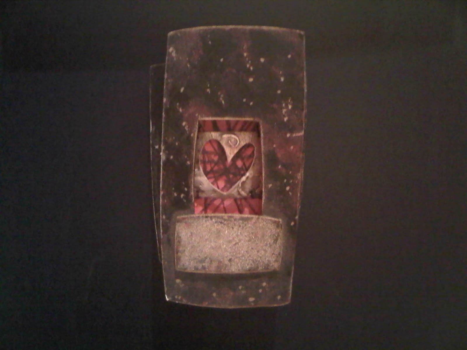 From Glenn I have many creative oddities on display, including a necklace with a pendant made from a doll’s arm spray-painted gold, a bat necklace, a chicken bone painted black and gold and partly wrapped in foil, a silver cut-out heart in a box, a picture of a man playing the cello signed on the back: “G n Charlie” (Charlie was his dog). I also have a purple bathmat he gave me, which is not currently in use. I have other gifts and cards from Glenn hidden away in boxes.